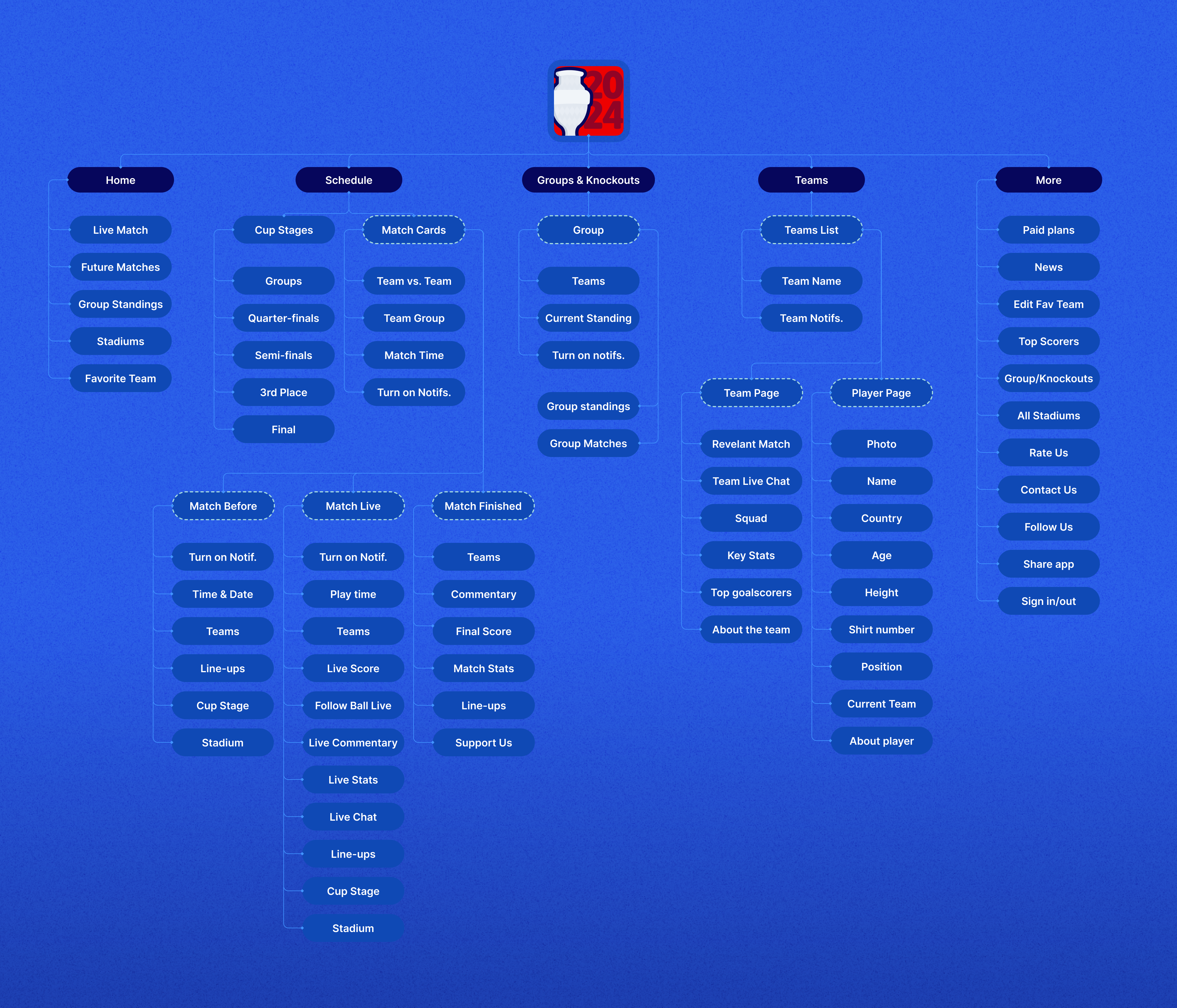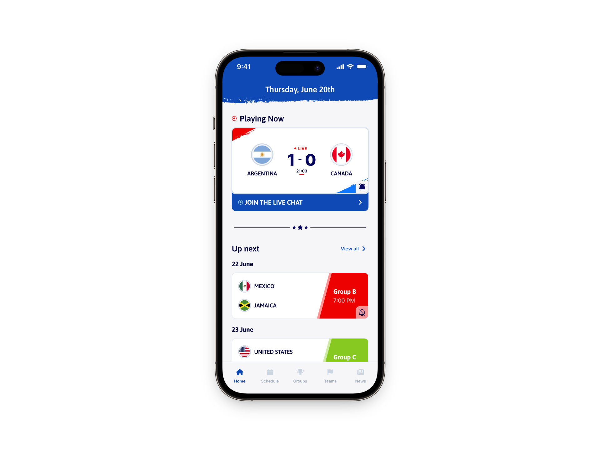 A clear and welcoming overview that unites all the different features the app provides, giving fans an instant snapshot of the tournament the moment they open the app.