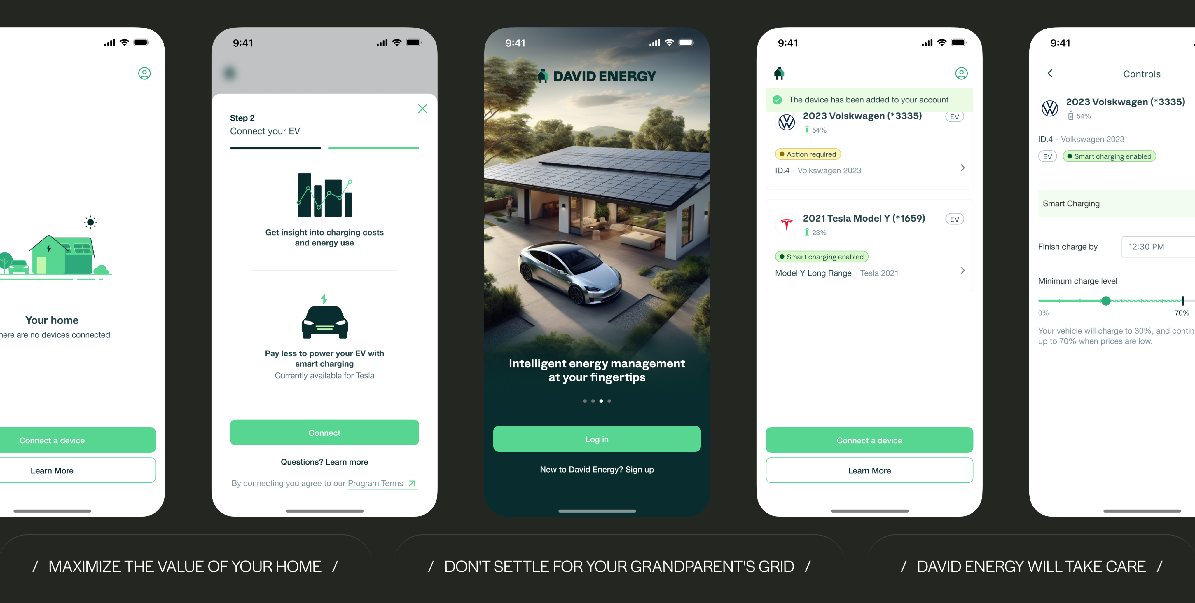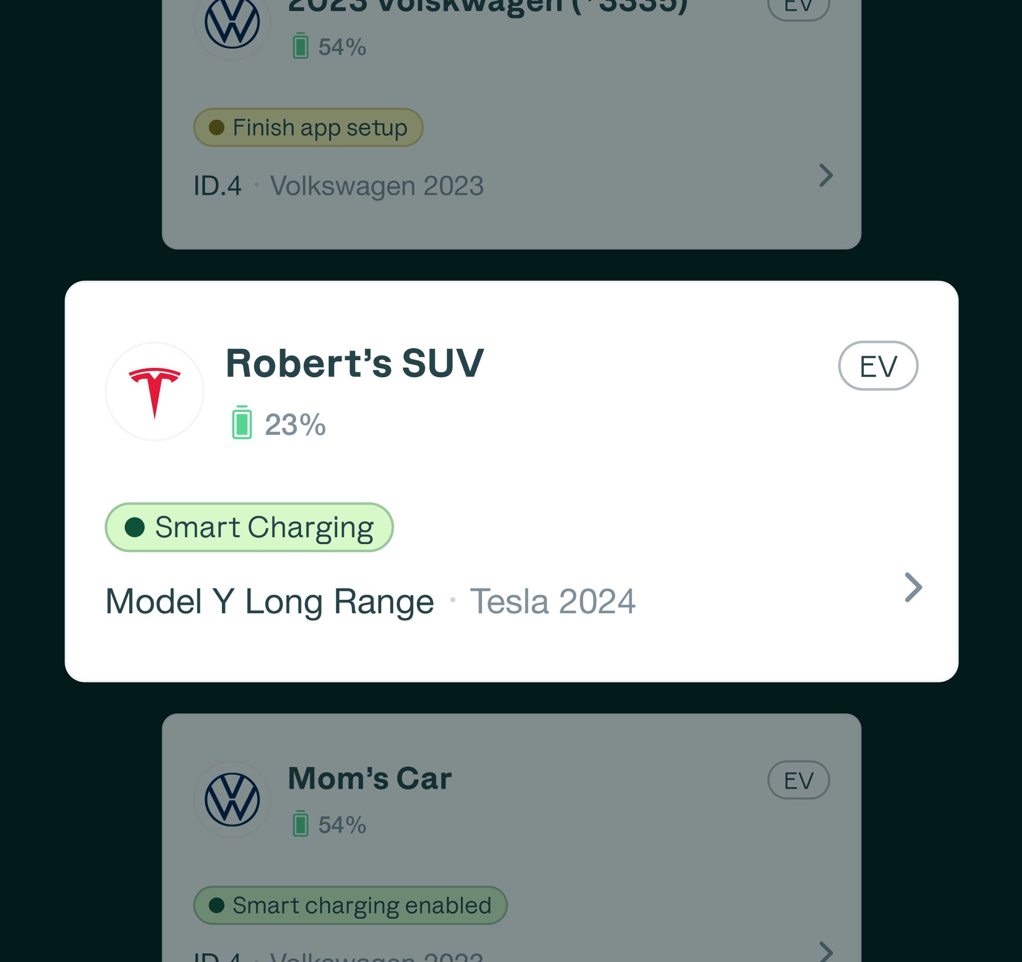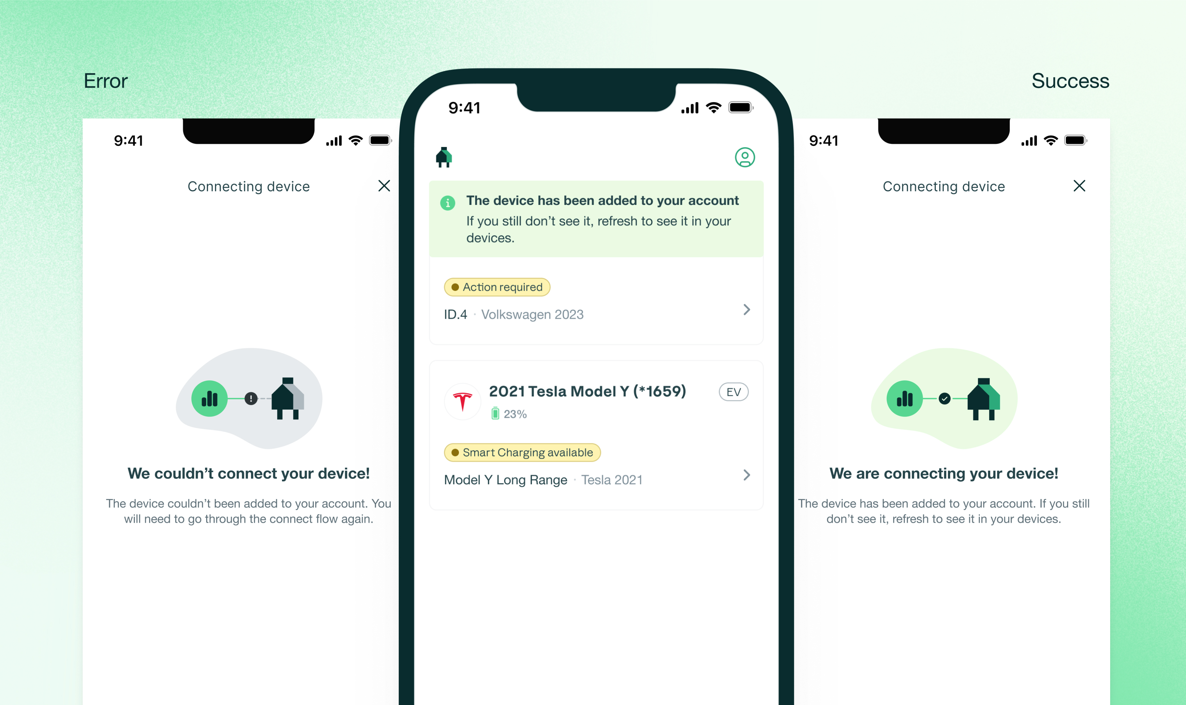 Our onboarding guides users through connecting providers like Tesla and Volkswagen with clear steps and instant verification. In minutes, their entire home is online and ready.